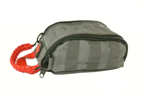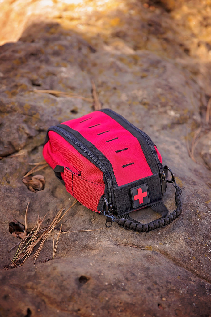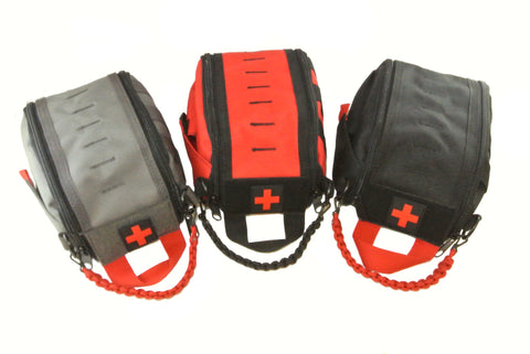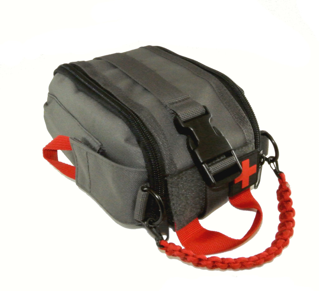 This is only the pouch, no kit contents are included. All handles are a contrasting color for quick identification. The paracord handle allows the user to hook it around an available surface, ie: gear shift or aircraft yoke, and then open the kit single-handed to gain access to the contents. This is our unique design, taking into consideration that the user may be alone when the incident occurs.